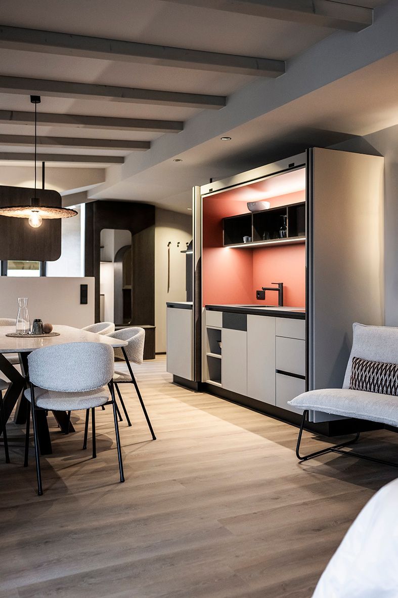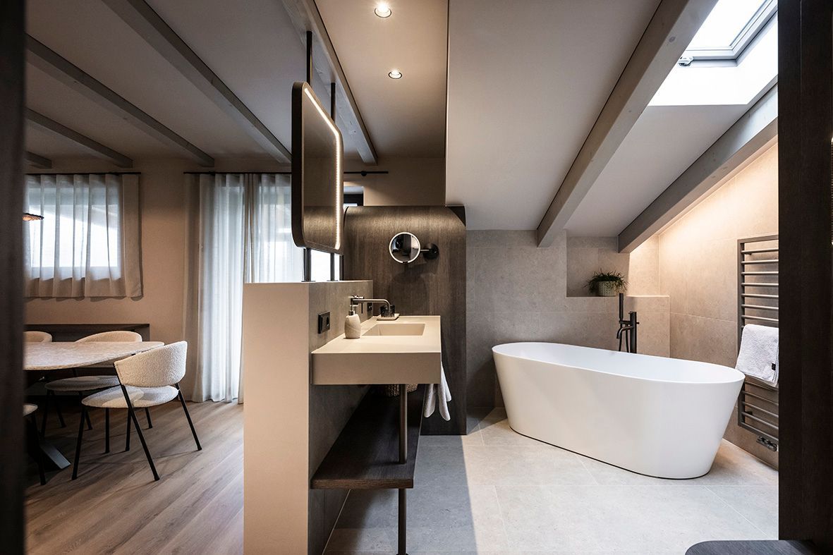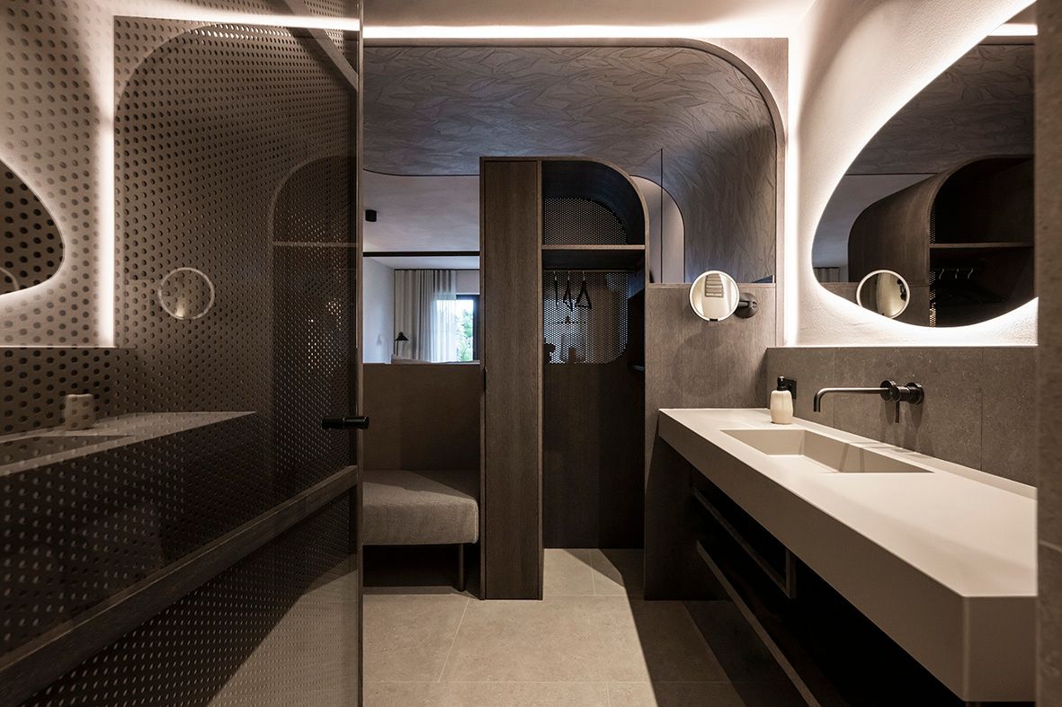 Un giardino mediterraneo di 4.000 m² ai piedi del Gruppo di Tessa, tra palme, ulivi, cipressi e viti: è questo paesaggio inatteso a ispirare il progetto dello studio NOA per i 13 nuovi appartamenti dell’Hotel Nutzhof. Gli interior designer hanno portato all’interno l’atmosfera di quiete del parco, trasformando la camera in un ambiente dove la soglia fra bagno, zona notte e soggiorno si dissolve in una continuità fluida. Uno spazio interamente dedicato a una nuova dimensione di benessere.